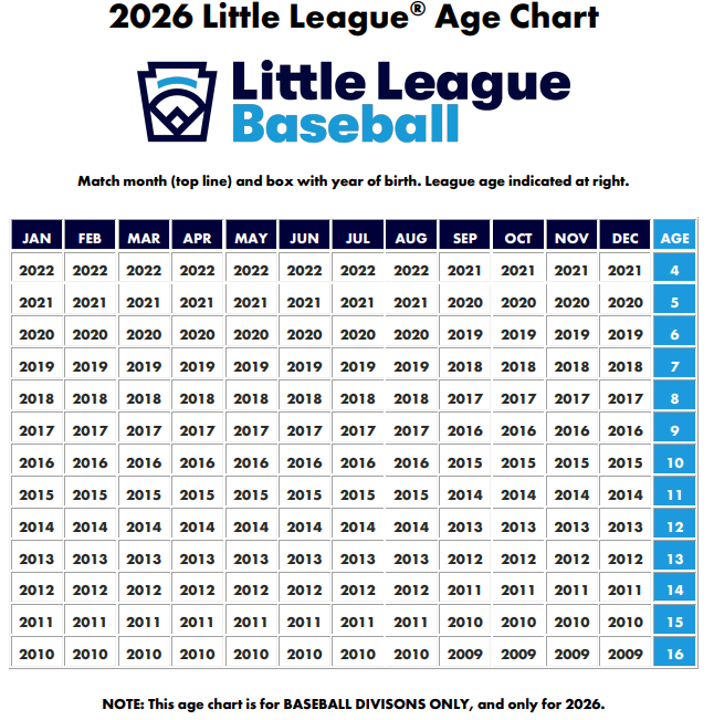Your player’s league age is determined by the Little League Baseball® and Little League Softball® Age Charts. The dates for baseball and softball are different, but each determines the division in which your Little Leaguer will play this season. The Age Determination Date for a Baseball player is the actual age of a child on August 31 of the current year. The Age Determination Date for a Softball player is the actual age of a child on December 31 of the previous year.